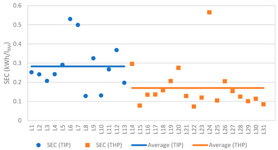 Specific Energy Consumption (SEC) for Traditional Industrial Producers (TIP) and Traditional Handmade Producers (THP).