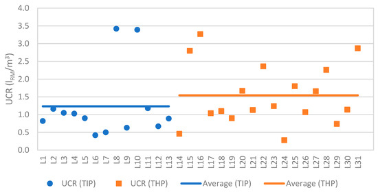 The average Usage of Cold Room Volume was slightly higher for Traditional Portuguese Farmhouse Cheese facilities (1.54 lRM/m3) compared to Traditional Portuguese Industrial Cheese facilities (1.24 lRM/m3), as shown in Figure 7. This difference is attributed to the fewer and smaller cold storage rooms typically found in Traditional Portuguese Farmhouse Cheese production units. The lowest UCR value observed among Traditional Portuguese Farmhouse Cheese facilities (0.28 lRM/m3) was recorded in unit L24, a consequence of its low production activity. Within the Traditional Portuguese Industrial Cheese category, units L8 and L10 exhibited the highest UCR values (3.42 and 3.39 lRM/m3, respectively). These facilities were the largest in the study and processed a high percentage of cow’s milk, factors associated with a high turnover of products within their cold storage rooms.