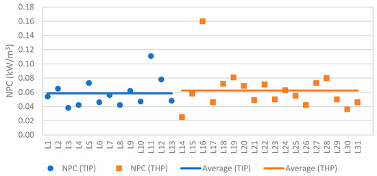 The average Nominal Power of Compressors per Cold Room Volume was comparable for both Traditional Portuguese Industrial Cheese and Traditional Portuguese Farmhouse Cheese facilities (0.060 and 0.063 kW/m3, respectively). Units L11 and L16 exhibited NPC values (0.11 and 0.16 kW/m3, respectively) considerably higher than their respective category averages, which could suggest an oversizing of compressor nominal power. However, this does not appear to result in excessive electricity consumption per unit of raw material processed, as their Specific Consumption of Electrical Energy values (0.267 and 0.135 kWh/lRM, respectively) are below the average for each category. Furthermore, unit L16 demonstrated the highest Usage of Cold Room Volume (3.27 lRM/m3) within the Traditional Portuguese Farmhouse Cheese category, potentially indicating a high turnover of products within its cold storage facilities.