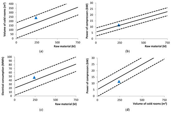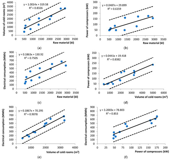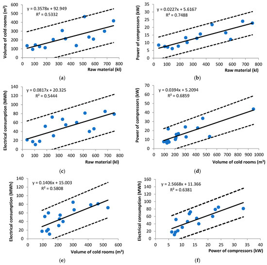 Figure 8 and Figure 9 present the experimental results and graphical representations of the linear regressions, including the upper and lower bounds of the 95% confidence intervals, for the relationships between (i) cold room volume and raw material volume; (ii) compressor power and raw material volume; (iii) electrical energy consumption and raw material volume; (iv) compressor power and cold room volume; (v) electrical energy consumption and cold room volume; and (vi) electrical energy consumption and compressor power. In all cases, the coefficient of determination (R2) exceeded 0.6, indicating a strong correlation between the linear regression models and the experimental data. All experimental data points fell within the 95% confidence interval.