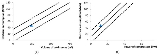 The nominal electrical power of the compressors was determined by assessing the evaporation and condensation temperatures, along with the degree of overheating, using manufacturers’ catalogues and software resources. This methodology was validated through a process of randomly selecting a subset of compressors and measuring the electric current intensity, voltage input, and power factor using an Escort ECT-620 clamp meter (Escort Instruments Corporation, Taipei, Taiwan), which has a documented accuracy of 1.5%. The observed discrepancies between the two measurement methods consistently remained below 10%. Three key energy performance indicators were employed in the analysis: Specific Energy Consumption, Usage of Cold Rooms’ Volume, and Nominal Power of compressors per Cold rooms’ volume.