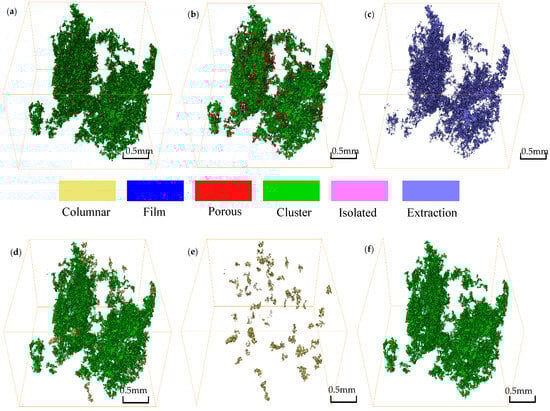 The composition and proportion of pixels at the identical position in diverse stages were selected. That is, the proportion of remaining oil was determined, along with the type and proportion of remaining oil that could be transformed at different stages, such as cluster remaining oil, the type and proportion of convertible remaining oil, and the proportion of cluster remaining oil production at a certain stage. Taking the conversion of cluster residual oil in the saturated oil–water flooding process as an instance, the specific process is depicted in Figure 2. Figure 2a presents the 3D topology of the clustered remaining oil in the saturated oil state, where oil clusters exhibit large continuous phases. After water flooding to a certain extent, the whereabouts of oil clusters are categorized into two types: the first type of oil clusters are gradually dispersed, and the areas affected by water are produced with injected water (Figure 2c); the second type of oil cluster is the unused cluster residual oil. This portion of the cluster residual oil constitutes a large proportion and exists in the area far from the dominant channel; thus, the sweep amplitude is small, and it commences to transform into a discontinuous phase, that is, from cluster to porous, columnar, film, and other remaining oil types (Figure 2b). Similarly, after the conclusion of water flooding, the composition of the cluster remaining oil can be divided into two categories. The first type is the cluster remaining oil that has not been driven by water or has not been fully utilized (Figure 2f), which is the main target for the further exploration of the potential of the oilfield. Another type of cluster residual oil originates from the transformation of porous, columnar, and other residual oils (Figure 2d,e). The proportion of cluster remaining oil is mainly influenced by the transformation type of remaining oil and the heterogeneity of the micro-pore throat structure. For the reservoirs with complex microstructures, small pore throats, and strong heterogeneity, the remaining oil type conversion is prone to occur due to the dominant capillary action during waterflood development.