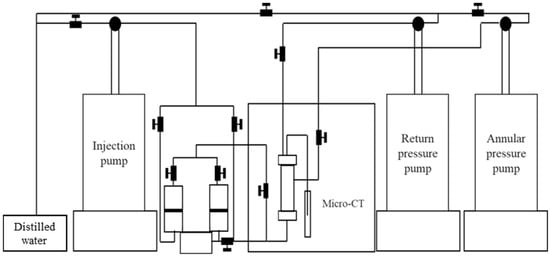 The experimental device comprises three parts: the microinjection system, the oil–water seepage simulation system, and the CT scanning imaging system (Figure 3).