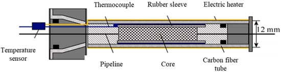 - Oil–water seepage simulation system: The special core gripper [] (Figure 4), made of carbon fiber resistant to high temperatures and high pressures, is employed to achieve online in situ CT scanning [,,] and auxiliary heating functions.
