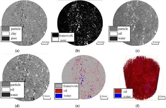 The software “Imagel” (1.8.0) is utilized to undertake noise reduction, gray binarization, and color gamut adjustment on the reconstructed data subsequent to CT scanning. The distribution of gray value is modulated in accordance with the mineral density and atomic number within the rock. The greater the density and atomic number, the higher the gray value after scanning, which is manifested in the image as a more luminous color. Figure 6a constitutes a small plunger dry sweep map presenting a large gradient of gray value, facilitating the discrimination of the pore structure from the rock skeleton (refer to Figure 6b). The clay content is substantial, the pore distribution is dispersed, and the large and connected pores are mainly distributed in the center and lower edge area, accompanied by strong heterogeneity. After constant-velocity oil flooding (refer to Figure 6c), the gray values of the clay and oil phases are analogous, and the segmentation of threshold values is inclined to induce a considerable error. Hence, by taking the white areas common to Figure 6b,c, the actual oil phase distribution and proportion subsequent to the elimination of clay minerals can be acquired. When the identical method is applied to the CT scan images of different displacement stages, such as the water displacement stage (refer to Figure 6d), a three-phase segmentation diagram of the oil phase, water phase, and rock skeleton with high precision can be attained (refer to Figure 6e). Eventually, the oil–water three-dimensional recombination is executed, the remaining oil types are categorized (refer to Figure 6f), and the proportion of crude oil utilization and type transformation in different stages is determined.