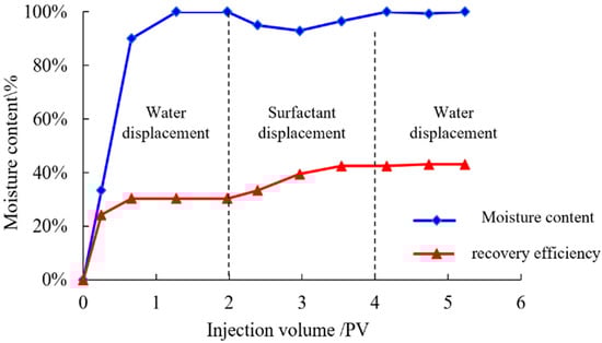 Figure 7 delineates the variations in the utilization of remaining oil and alterations in water cuts during the entire displacement process. After 2PV of water flooding, the water cut attains 100%, and the recovery rate amounts to 30.3%. With 2PV of surfactant flooding, the water cut initially declines and subsequently increases. In comparison to the water flooding stage, the recovery rate ascends by 12.1 percentage points. After the subsequent 1PV of water flooding, the recovery rate experiences a marginal increase of merely 0.6%.