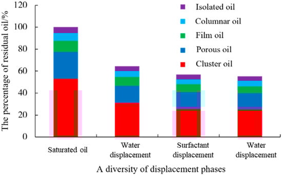 Upon noise reduction, gray-scale binarization, and the image segmentation of the CT scan images of the small plunger (with a diameter of 8 mm), the proportion of remaining oil of the small plunger (with a diameter of 8 mm) was extracted and calculated in four phases: the initial state, water flooding, surfactant flooding, and subsequent water flooding (Figure 8). The low-permeability core is characterized by small pore throats and pronounced heterogeneity, leading to the scattered distribution of crude oil in the initial stage. The discontinuous phases, such as film, columnar, and isolated forms, accounted for 22.5%. After water flooding until a 100% moisture content was attained, the continuous-phase remaining oil (cluster and porous) was exploited to a greater extent, with the proportion decreasing by 30.8%, while the non-continuous-phase remaining oil (film, columnar, and isolated) was exploited to a lesser extent, only 4.6%. After surfactant flooding until a 100% water content was reached, the remaining oil of the continuous phase and non-continuous phase decreased by 5.83% and 1.94%, respectively. After subsequent water flooding until a 100% moisture content was achieved, the proportion of the five types of remaining oil remained essentially unchanged.