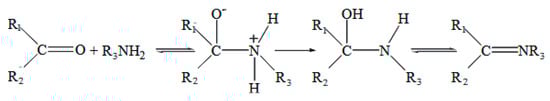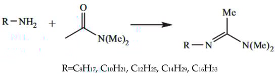 The carbonyl amine condensation reaction synthesizes amide compounds by forming carbon–nitrogen double bonds, a classic synthetic method. This reaction typically involves aldehydes, ketones, and other carbonyl compounds reacting with primary amines or hydrazines, following an addition–elimination reaction mechanism. The reaction process is shown in Figure 2. The carbonyl and amine groups undergo condensation to form the intermediate product α-hydroxyamine. Due to its instability, it undergoes a dehydration reaction. The hydroxyl group eliminates a hydrogen atom from the adjacent carbon, resulting in the formation of a carbon–nitrogen double bond. In this process, the formation of the intermediate α-hydroxyamine is the key step determining the reaction rate, which is directly related to the nucleophilicity of the amine and the electrophilicity of the carbonyl carbon atom, both of which are proportional. These reactions are generally carried out under acidic conditions; however, excessive acidity may reduce the nucleophilicity of the amine. Therefore, maintaining a pH of 4 typically optimizes the reaction. Mei [90] suggested that the reaction rate is fastest when the pH value is 4. Qiao [91] synthesized a series of amidoamine surfactants by reacting octylamine, decylamine, dodecylamine, tetradecylamine, and hexadecylamine as raw materials with N,N-dimethylacetamide in chloroform as a solvent at 70 °C for 12 h. The synthesis procedure is shown in Figure 3.