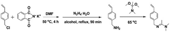 The indirect method first converts carbonyl compounds into intermediates, such as hemiacetals, which then react with amines under milder conditions to prepare amidines. For example, in the reaction of amides with carbonyl compounds, the carbonyl group of the amide reduces the nucleophilicity of the amine, leading to a slower reaction rate. Additionally, the imine C=N double bond formed has high polarity, which increases the electrophilicity of the carbon atom, making it more susceptible to nucleophilic attack. Direct use of this method is not economically efficient; the process is complex and difficult to control. However, if the carbonyl group is modified into more reactive forms, such as hemiacetals, geminal halides, or enol esters, before the reaction, the reactivity can be enhanced. This allows the reaction with amides to proceed under milder conditions, while also increasing the yield. Liu [92] first converted 4-vinylbenzyl chloride into 4-vinylbenzylamine via the Gabriel reaction, then synthesized 4-vinylbenzyl amidine by reacting it with N,N-dimethylacetamide dimethyl ether under nitrogen protection. The synthesis route is shown in Figure 4.
