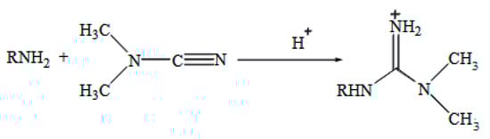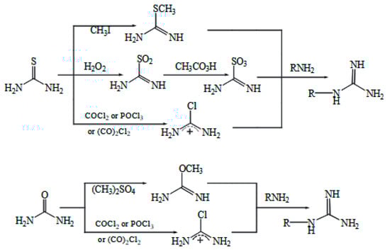 The preparation of alkyl guanidines in industry typically involves the reaction of cyanamide with amines [93]. This preparation method has a straightforward process, and its synthesis route is illustrated in Figure 5. The reaction of thiourea with amines is a classic method for preparing guanidine compounds, utilizing S-methyl isothiourea. The synthesis route is shown in Figure 6. However, this reaction produces toxic methyl mercaptan. To prevent the formation of toxic alkyl mercaptans, hydrogen peroxide and other oxidants can be employed to oxidize thiourea to thioperoxide prior to reacting with amines [90]. Additionally, the direct use of urea, instead of thiourea, can effectively prevent the formation of toxic alkyl mercaptans. Urea and thiourea can also react with phosgene, oxalyl chloride, or phosphorus trichloride at low temperatures to form “Vilsmeier salts”, which then react with amines to produce guanidines [94]. These methods not only avoid harmful by-products but also expand the synthetic strategies for guanidine compounds.