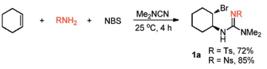 In recent years, Zhou [95] reported a novel electrophilic Br-initiated cascade reaction, applicable to the synthesis of aminoalkoxylation and imidazolines. Additionally, the team found that this method is also applicable to the synthesis of guanidine [96]. By reacting a mixture of N-bromosuccinimide (NBS), p-toluenesulfonamide (TsNH2), cyclohexene, and N,N-dimethylcyanimide at 25 °C for 4 h, guanidine is synthesized with a yield of 72%. If p-nitrobenzenesulfonamide (NsNH2) is used in place of p-toluenesulfonamide (TsNH2), the yield increases to 85%. This method is straightforward and involves mild reaction conditions, making it suitable for industrial production. The synthesis route is illustrated in Figure 7.