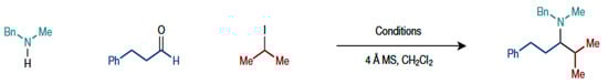 - Kumar, R.; Flodén, N.J.; Whitehurst, W.G.; Gaunt, M.J. A General Carbonyl Alkylative Amination for Tertiary Amine Synthesis. Nature 2020, 581, 415–420. [Google Scholar] [CrossRef]
