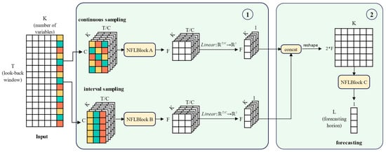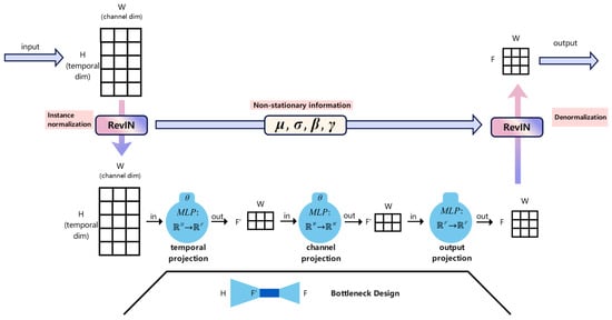 In the NFLBlock architecture, RevIN aims to handle the dynamic statistical properties in the input matrix, so that the feature distribution of the training and test data is more stable. Firstly, the input sequence is normalized, and then the inverse normalization layer performs a reverse normalization operation on the module output to the same extent as the normalization layer, thereby restoring the statistical information from the original distribution back into the module output. NFLBlock repeatedly performs channel projection on each time step, and when processing longer time series, the computational complexity significantly increases. To reduce computational costs, NFLBlock adopts a bottleneck structure. It is called a “bottleneck” because a smaller intermediate length is introduced into the structure, which is much smaller than both and . That is, the length of the input sequence is first projected through a temporal projection layer. Then, channel projection is performed times to realize information exchange, and finally, the output projection layer projects the features of length back to the required output length . The bottleneck structure greatly reduces the amount of repetitive channel projection calculation.