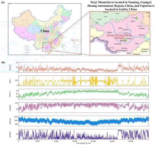 This study uses two real wind farm datasets from Guangxi, China, to verify the effectiveness of the proposed model. These two wind farms are the Fujia Tian Wind Farm, located in Guilin City, and the Xiayi Mountain Wind Farm in Nanning City, with their geographical locations marked in Figure 3a. These datasets cover the period from 1 January 2021 to 31 December 2021, with recordings every 15 min (96 recordings per day), comprising 33,994 and 34,736 observations, respectively. Each dataset includes six sequential variables: wind speed, wind direction, temperature, humidity, atmospheric pressure, and actual wind power, which are used to predict future wind power in the model. The original dataset of Xiayi Mountain Wind Farm is shown in Figure 3b. For the missing values in the dataset, this paper employs linear interpolation to fill all the missing values. In terms of dataset division, each dataset is split into training, test, and validation sets in the ratio of 7:2:1.