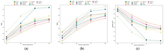 In Experiment 1, we tested the predictive performance of various models using the Xiayi Mountain dataset. Table 3 presents a comparison of the MSE, MAE, and results for different forecasting horizons between the proposed model and other models, with the best and second-best results marked in bold and underlined, respectively. Smaller values of MSE and MAE and the larger the value of , indicate better predictive performance of the models. From this, we can draw the following experimental conclusions:
