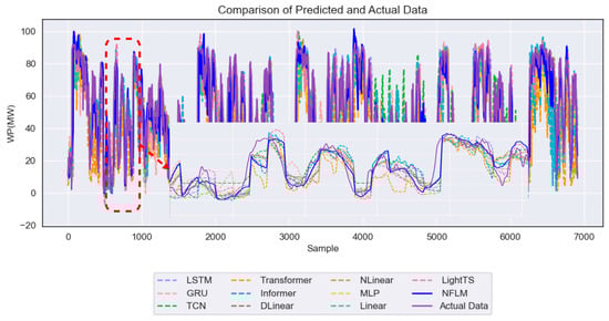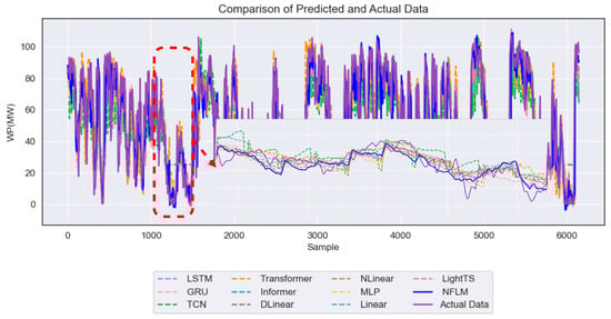 Figure 7 displays the comparison between the predicted wind power values and the actual power values of all models during the testing phase for the 24-step forecasting experiment. It can be observed that under the same trend, NFLM more closely matches the actual data values in most cases.