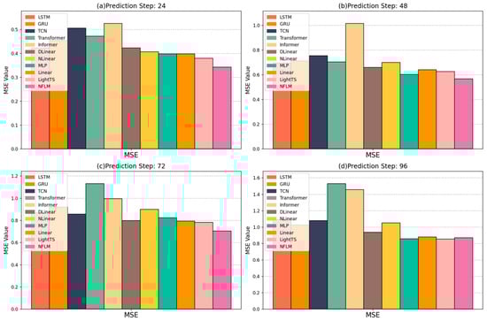 Figure 6 shows the comparison of MSE of all models in four forecasting steps through a bar graph. As shown in Figure 6, NFLM’s MSE is clearly lower than that of the other comparison models in the first three prediction steps. Its prediction error at the 96-step horizon is similar to that of MLP, Linear, and LightTS. The Transformer model performs better than the TCN and Informer models in the 24-step and 48-step ahead forecasts. However, due to the limitations of its attention mechanism, the MSE and MAE of the Transformer show a significant upward trend when the forecasting step length increases. This is particularly evident in the 72-step and 96-step ahead forecasts, where its performance is significantly lower than other models.