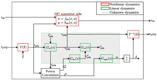 The grey-box modelling strategy of the GFM converter shown in Figure 1 is illustrated in Figure 3. The model in Figure 3 is composed of non-linear blocks (in red) and linear blocks (in green). The non-linear dynamics of the DC side of the converter and DC voltage control dynamics indicated in (11), (12), and (14) are assumed to be known without uncertainty by assuming that the DC link capacitor and the control tunings for the PI controller are known.