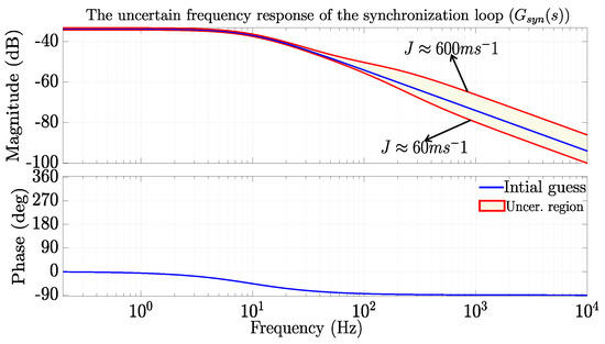 The uncertainty definition by means of and must be conducted with several considerations, for the unknown real plant to represent all the possible synchronization loop implementations and their parameter tuning. The relations and equivalency of all those implementations are discussed in [23,31] by properly choosing their parameters. The representation of the synchronization mechanisms are highly different at high-frequency ranges so, it is reasonable to assume higher uncertainty at high-frequency ranges to be able to represent all of them. In the light of this, is chosen 1.5 (150% uncertainty on the nominal plant ) and is chosen to be low at low frequency and high at high frequency. Based on the assumptions made to consider all the possible synchronization loop implementations, the transfer function of the uncertainty is given by Equation (18).