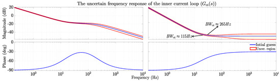 where and are chosen to give high uncertainty in the high-frequency range and low uncertainty in the low-frequency range. The uncertain transfer functions of the inner current loop implementations lays in the yellow region, as depicted in Figure 8.