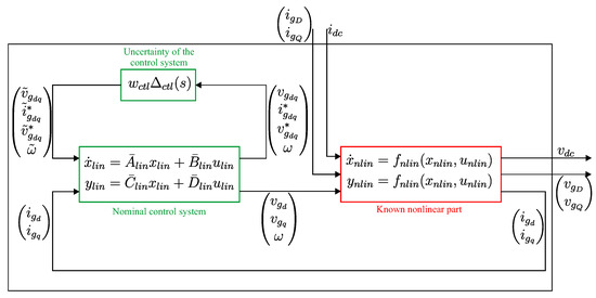 The remaining blocks of the converter model in Figure 3 that lay outside the dashed green rectangle (dc converter side, rotation matrices, and frequency/angle differential relationship) are embedded into the block known non-linear part, as shown in Figure 9 with red outline. The resulting converter model in Figure 9 is favourable for robust stability analysis, since the uncertainty of the control system is interconnected with a fully linear subsystem and the converter non-linear part is isolated and cannot be directly affected by the uncertainty. One of the key advantages of the converter model proposed in this paper is its capability to take in to account the converter non-linearities, which is not addressed in previous articles in the same area of interest [32,33].