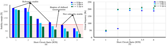 Robust stability analysis results for different SCR and grid voltage values: (a) Stability margin and (b) Critical frequency.