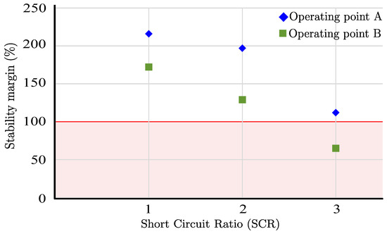The stability margin of the grid with the considered converter is obtained for different voltage levels under different SCR values, as depicted in Figure 10, by considering the parameters in Table 4. In stability analysis, a higher stability margin signifies a greater ability of the system to maintain stability under varying conditions [29,30]. Therefore, the study of robust stability using stability margin follows the following rule: