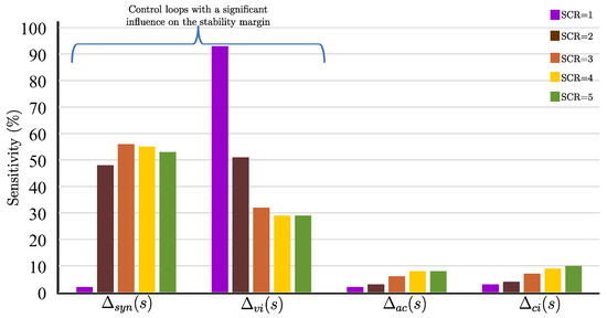 The sensitivities of robust stability margins concerning each control loop uncertainties were analyzed in percentage to characterize how the variation in normalized perturbations of each control loop affects the grid stability margin. This analysis is necessary because it shows which control loops mainly affect overall system stability under uncertainties and gives insight into the influence of each control loop on the grid stability. The obtained results from the simulation of the model are presented in Figure 12 for different short circuit ratio values of the grid. For the considered cases, it is found that the reactive power AC voltage and the inner current loop design and tuning have less impact on the stability margin. On the other hand, the synchronization loop and the inner voltage loop tuning have a higher impact on the stability margin.