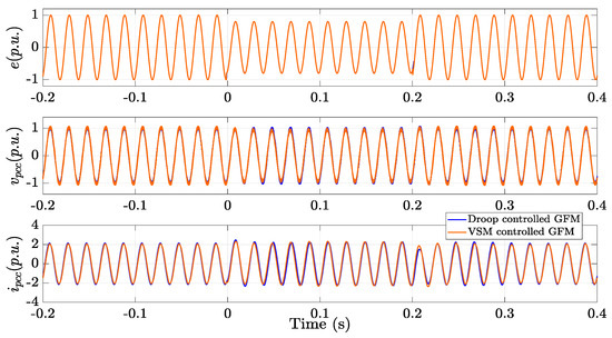 To ensure the accuracy of the results from the robust stability analysis, it is essential to verify that the mathematical model developed in Section 2 accurately reflects the behaviour of GFM converters. Due to the sense of generality of the model of the converter, the validation is performed with two control system implementations of GFM converters, i.e., Droop and VSM.