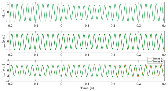 To verify the sensitivity analysis result of which control loop tuning is playing a significant role in the stability of GFM converters-dominated grids, a real-time simulation is performed considering two tuning cases as defined in Table 5. The result in Figure 16 indicated by orange colour is obtained by using the case Tuning A, for which the synchronization and the inner voltage loop are tuned, while the reactive power AC voltage loop and the inner current loop remain unchanged from their initial settings. In this case, the stability of the grid is significantly distorted, underscoring the critical role of precise tuning in both the synchronization and inner voltage loops in the stability of the grid. Differently, the result indicated by green colour in Figure 16 demonstrates the second case, Tuning B, wherein the reactive power AC voltage loop and the inner current loop are tuned, and the synchronization and the inner voltage loop remain unchanged from their initial settings. In this case, the effect in the stability of the grid is insignificant, implying the reactive power AC voltage loop and the inner current loop tuning do not play a significant role in the stability of the GFM converters-dominated grids.