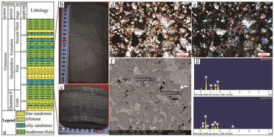 Rock characteristic images of interlayers. (a) The lithology of Qingshankou formation. (b) petrophysical interlayer. (c) Argillaceous interlayers. (d) Argillaceous interlayer plane light characteristics. (e) Argillaceous interlayer cross-polarized light characteristics. (f) Argillaceous interlayer SEM characteristics. (g) Argillaceous interlayer FE-EDS analysis results.