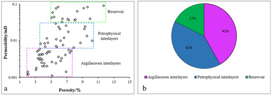 The petrophysical properties of the core samples were evaluated using gas permeability and gas porosity methodologies. Analysis of the results reveals a wide distribution range in reservoir permeability, indicating significant heterogeneity within the formation. Multiple interlayer samples were subjected to a detailed examination, revealing that the overall permeability was less than 0.03 mD, and the porosity was less than 12% (Figure 3a). The petrophysical interlayers exhibited porosity values below 11%, with permeability ranging from 0.006 to 0.03 mD (Figure 3b). Argillaceous interlayers exhibited distinctively low permeability characteristics, effectively rendering them impermeable barriers within the reservoir system. The porosity of the argillaceous interlayers ranges from 1% to 8%, with permeability values spanning from 0.001 to 0.005 mD. Notably, these samples represent 42% of the total analyzed, indicating a significant presence of these ultra-low-permeability zones within the reservoir (Figure 3b). This high proportion of argillaceous interlayers contrasts with the overall effective reservoir properties. The flow data analysis for the entire sample set reveals an average porosity of approximately 8% and a mean permeability of approximately 0.06 mD. The prevalence and low permeability of these argillaceous interlayers likely play a crucial role in compartmentalizing the reservoir and influencing fluid flow patterns.