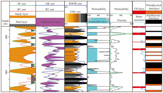 To address these challenges, this study selects sensitive curves for identifying different types of interlayers. Based on the normalization technique of well-logging curves to eliminate dimensionality, we prioritize well-logging curves that demonstrate a good response to two types of interlayers and have complete data, including the curves of spontaneous potential (SP), gamma ray (GR), resistivity (RT), density (RHOB), and volume of shale (VSH). The normalization process is conducted using the following Equation (1) [14]: