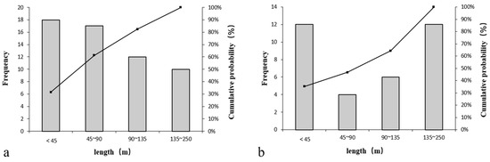 The planar distribution range of the interlayer is determined by its length, which includes the extension length in both the X and Y directions. The length of the interlayer is consistent with the length of the study block and the section length. By default, the inter-layer is defined as the interbed with a certain thickness and stable distribution between the injection well and the production one. To conduct numerical simulation research on reservoirs in the later stage, it is necessary to examine the length distribution characteristics of interlayers within a 250 m range.