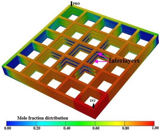 Mole fraction distribution in various thicknesses of petrophysical interbeds during 10 years of CO2 flooding.