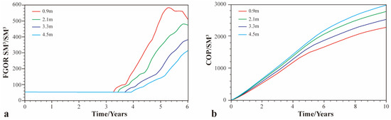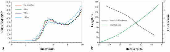 Effects of different thicknesses of interbeds with length and width of 90 m on FGOR (a) and cumulative oil production (b).
