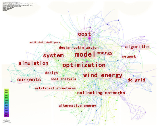 To offer a comprehensive overview of the existing scholarly work on collector systems for offshore wind farms, a bibliometric analysis was conducted. Figure 1 illustrates the research findings in this domain through CiteSpace [5]. The literature included spans the last decade, sourced from a search for “offshore wind farm collector system” on the Web of Science platform. The keywords within these documents are highlighted with various colors in the figure. As depicted in Figure 1, recent research in the realm of offshore wind farm collector systems has concentrated on several pivotal areas, including modeling, cost analysis, algorithm development, and design optimization. The exploration of these topics significantly influences the advancement of offshore wind energy. This analysis mirrors the pressing challenges faced in the evolution of offshore wind power and broadly outlines the research trends within the field. It positively contributes to accurately discerning the research trajectory.