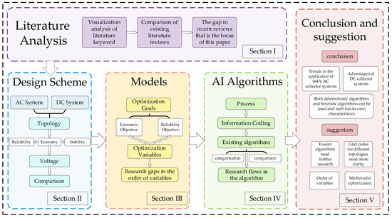 Figure 2 illustrates the overarching framework and pivotal components of this paper. The foundation of this review is to ascertain the current research trends in the offshore wind power sector by visualizing and analyzing the keywords from the literature of the past decade using CiteSpace in Section 1. Building on this, Section 2 compares AC and DC collector systems with varying topologies and voltage ratings, evaluating their economic, stability, and reliability metrics. Section 3 discusses the research on optimization models, encompassing optimization objectives and variables, and highlights the research gaps in this area. Section 4 compares AI-based optimization algorithms for addressing these issues, reviewing the algorithmic processes, information encoding, and other technical aspects. Finally, Section 5 presents conclusions, identifying the research shortcomings and proposing future research directions.