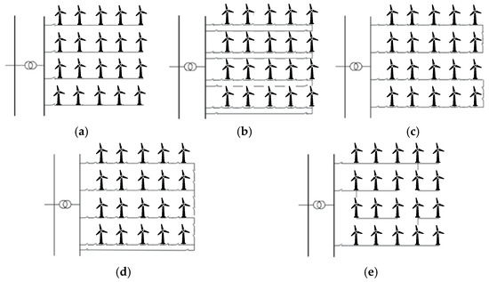 Common topologies of AC collector systems for offshore wind farms: (a) chain type; (b) single-side ring; (c) double-side ring; (d) composite ring; (e) star type.
