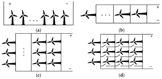 DC collector system topology; (a) tandem type; (b) parallel type; (c) series-parallel type; (d) matrix interconnect type.