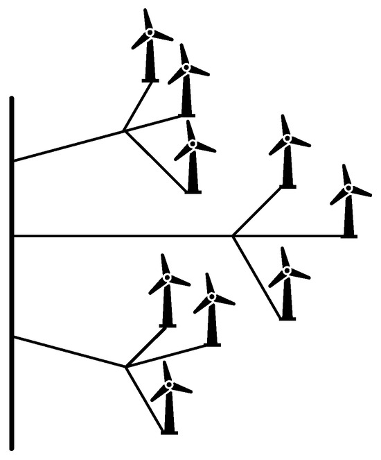 DC collector system configurations predominantly encompass series, parallel, series-parallel, and matrix interconnections, as depicted in Figure 4. A novel radial DC collector system topology, specifically designed for irregularly arranged wind turbine generators (WTGs), has garnered extensive research attention, as illustrated in Figure 5. Further investigation is warranted to assess its economic viability and reliability. An alternative topology has been proposed to mitigate unit overvoltage by incorporating auxiliary connection paths, thereby maintaining the operation of fault-free units post-fault. This design effectively prevents the disconnection of the series branch from the collector system due to overvoltage induced by bypassed faulty units on fault-free units during severe faults in traditional series-parallel topologies, significantly enhancing the operational efficiency of offshore wind farms [18].