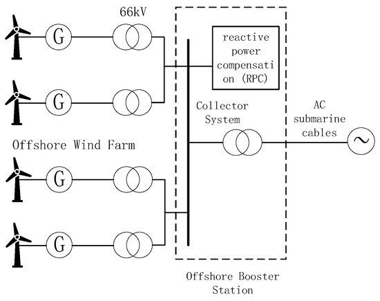 For offshore wind farms situated at greater distances, the loss in high-voltage direct current (HVDC) transmission schemes is considerably lower than that in alternating current (AC) transmission schemes [24,25,26,27]. Consequently, all existing long-distance wind farms utilize HVDC transmission schemes. Besides its inherent limitations, such as low current-carrying capacity, the 35 kV AC collection system also entails additional construction costs for offshore booster stations when integrated with high-voltage direct current transmission systems. In the 66 kV AC collection system design proposed by the European TenneT company, Arnhem, Netherlands, the offshore booster station, which has some functional overlap with the offshore converter station, has been eliminated. In this scheme, the generator-side voltage is increased to 66 kV and then directly connected to the offshore converter station through the collection system [28,29]. Compared to the traditional 35 kV collection system, this scheme can transmit the same power with cables of smaller cross-sectional areas, thereby significantly reducing the investment and laying costs of submarine cables. Furthermore, the higher voltage reduces system losses [24,30,31,32], and the reduction in the number of circuits facilitates maintenance, lowering the overall construction investment cost of the offshore wind farm collection system [33,34]. Concurrently, shorter collection lines and fewer cables greatly diminish the risk of damage to 66 kV collection system cables from ship anchors and equipment.