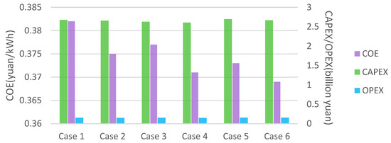 To address these challenges, a higher voltage collection scheme is often implemented. For offshore wind farms with large-capacity units of a similar scale, the 66 kV AC collection system, due to its more flexible topological line design, requires significantly fewer cables than the 35 kV AC collection system, thereby also reducing investment and construction costs. The wiring diagram is depicted in Figure 6. References [22,23] provide an in-depth comparison between the 35 kV and 66 kV collection systems. Figure 6 illustrates the investment costs, operational and maintenance costs, and the cost of energy (COE) for 35 kV and 66 kV collection systems at different single machine capacities for wind farms located 15 km and 40 km offshore. Reference [22] evaluates the economic viability of 35 kV and 66 kV collection systems from the perspective of capital expenditure (CAPEX), annual operational and maintenance costs (OPEX), and the cost of energy (COE) for primary electrical equipment and cables. The voltage levels, wind turbine capacities, and total capacities of the wind farms for the six comparative designs are presented in Table 2. Figure 7 displays the various costs, and the results indicate that, when considering the investment cost and operational and maintenance cost of the cables, the economic viability of the 66 kV AC collection system consistently outperforms the 35 kV scheme.