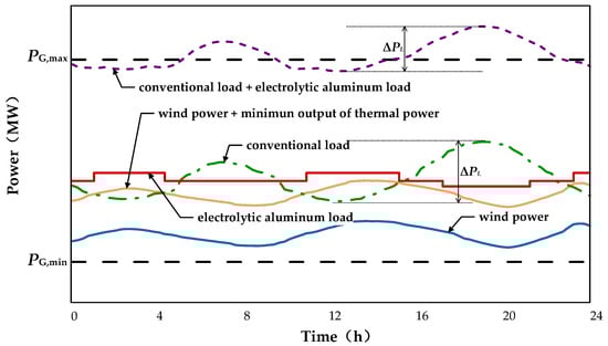 The randomness and volatility of wind power output pose a significant challenge to the peak-shaving capabilities of thermal power plants. If the combined wind power and load demand exceeds the regulation capacity of the thermal power plant, introducing the electrolytic aluminum load into the dispatch can effectively narrow the regulation range of the thermal plant, thereby improving wind power absorption, reducing wind curtailment, and enhancing the operational stability of thermal power plants. Figure 1 shows the conventional wind power grid connection. In Figure 1 and Figure 2, PG,max represents the maximum output of the thermal power unit, and PG,min represents the minimum output of the thermal power unit.