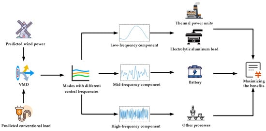 The subsequent chapters of this paper are arranged as follows: Section 2 explains the principle of balancing the system’s energy supply and demand through the scheduling of high-energy consumption loads in electrolysis aluminum; Section 3 discusses the VMD method for processing loads; Section 4 and Section 5 construct models for the entire process of electrolysis aluminum production; Section 6 develops a model for the deep peak-shaving of thermal power units; Section 7 details the operating principles and processes of this paper; Section 8 and Section 9 provide comparative analyses through scenario construction to verify the effectiveness and practicality of the model; Section 10 summarizes the research content and presents the conclusions.