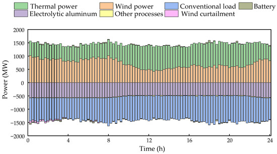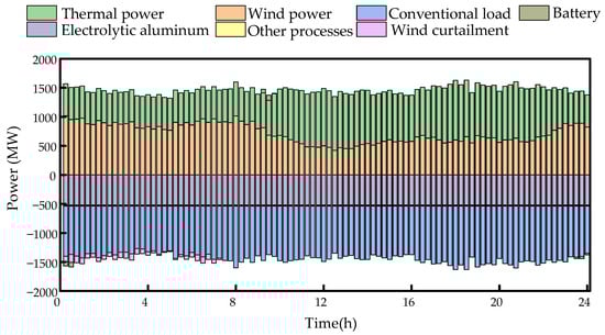 Figure 8 illustrates the supply–demand balance of the electrical load under the scheduling of Case 1. During the period from 0:00 to 7:30, the wind power generation is relatively high. However, during this period, the total output of thermal power plants’ regular peak shaving and wind power far exceeds the amount of electricity that can be absorbed by the conventional load and the full-process electrolytic aluminum production, forcing thermal power plants into deep peak shaving mode. At the same time, in order to minimize system operating costs, it is necessary to balance the additional costs of deep peak shaving by thermal power plants and the losses incurred from wind curtailment. As a result, some degree of wind curtailment occurs during this period. To mitigate this issue, the battery storage device continuously absorbs surplus power from 0:00 to 0:30, reducing the amount of wind curtailment.
