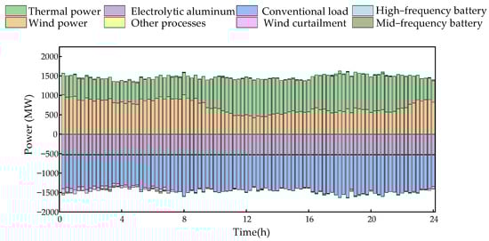 Figure 10 shows the supply–demand balance of the electrical load after the optimization scheduling of Case 3. During the period from 0:00 to 7:30, wind power generation remains at a high level. To promote wind power consumption, the thermal power plants maintain a low output level. At this time, the electrolytic aluminum production process appropriately increases its output, actively responding to load demand, reducing the additional costs caused by deep peak shaving of thermal power plants, and effectively decreasing wind curtailment. At the same time, the battery storage device actively collaborates with the mid-frequency components, continuously performing charge and discharge operations.