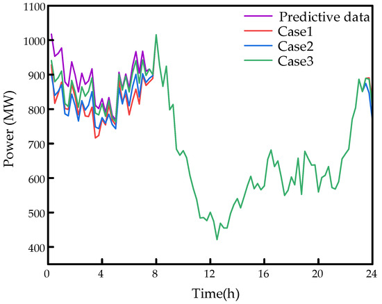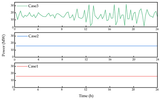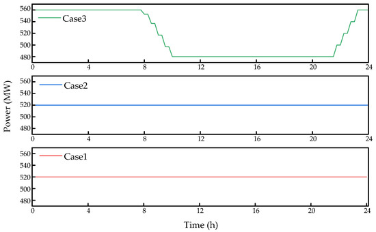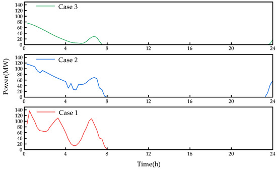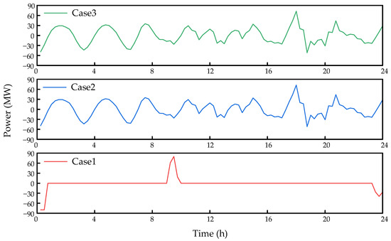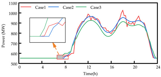 In Case 2 and Case 3, after introducing VMD, the battery storage device operates according to the mid-frequency components derived from the VMD decomposition. It participates in the scheduling process throughout, without entering standby mode. The battery storage device continuously responds to the net load fluctuations, effectively smoothing the output curve of the thermal power plants, thus improving their operational performance. This scheduling approach not only improves the system’s operational efficiency but also reduces the operational pressure on thermal power plants.