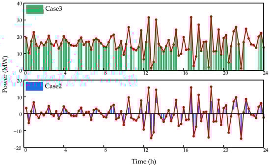 Figure 9 presents the supply–demand balance of the electrical load after the optimization scheduling of Case 2. The operational conditions of Case 2 are similar to those of Case 1. After introducing VMD, the smoother low-frequency components are responded to by thermal power plants, while the mid-frequency and high-frequency components with periodic oscillatory characteristics are continuously managed by the battery storage throughout the day. This makes the output of thermal power plants smoother, ensuring the stability and security of the system.