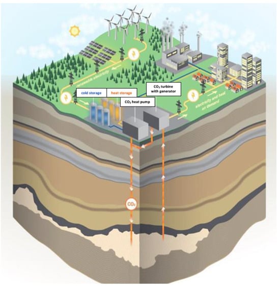 - Carro, A.; Chacartegui, R.; Ortiz, C.; Carneiro, J.; Beccera, J.A. Integration of energy storage systems based on transcritical CO2: Concept of CO2 based electrothermal energy and geological storage. Energy 2022, 238, 121665. [Google Scholar] [CrossRef]